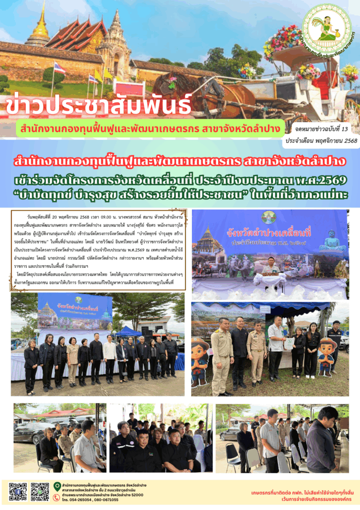 เช้าวันที่ 14 มิถุนายน 2567 นางสาวสิริลักษณ์ อุตเถิน หัวหน้าสำนักงานกองทุนฟื้นฟูและพัฒนาเกษตรกร สาขาจังหวัดลำปาง มอบหมายให้ เจ้าหน้าที่สำนักงานกฟก. สาขาจังหวัดลำปาง เข้าร่วมการประชุมสภากาแฟจังหวัดลำปาง ครั้งที่ 6/2567 โดยมีนายชัชวาลย์ ฉายะบุตร ผู้ว่าราชการจังหวัดลำปาง เป็นประธานฯ พร้อมด้วยนายชนาธิป เสมแย้ม นายพัชระ สิมะเสถียร รองผู้ว่าราชการจังหวัดลำปาง ผู้บริหารส่วนราชการ รัฐวิสาหกิจ เอกชน และภาคประชาชน เพื่อได้พบปะ พูดคุย แลกเปลี่ยนเรียนรู้ข้อราชการ รวมทั้งเผยแพร่ข้อมูลข่าวสาร ประชาสัมพันธ์ กิจกรรมของหน่วยงานได้อย่างกว้างขวางและต่อเนื่อง พร้อมทั้งยังเป็นเวทีให้แต่ละสังกัดกระทรวงได้พบปะแลกเปลี่ยนเรียนรู้ข้อราชการ ประสานการทำงานร่วมกัน โดยหน่วยงานสังกัดกระทรวงคมนาคมเป็นเจ้าภาพฯในครั้งนี้ ณ ห้องประชุมชมพู สำนักงานเทศบาลเมืองเขลางค์นคร อำเภอเมืองลำปาง จังหวัดลำปาง