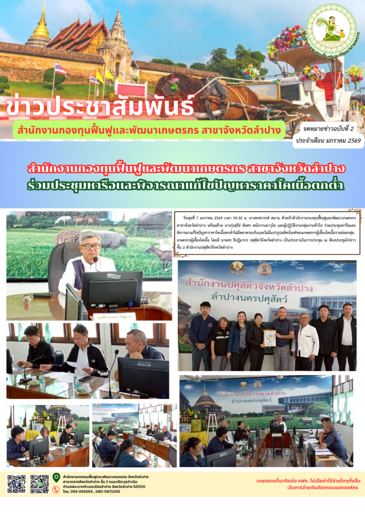 นางพรสวรรค์ สมาน หัวหน้าสำนักงานกองทุนฟื้นฟูและพัฒนาเกษตรกร สาขาจังหวัดลำปาง พร้อมด้วย นางรุ่งสุรีย์ ชัยศร พนักงานอาวุโส เเละผู้ปฏิบัติงานกลุ่มงานทั่วไป ร่วมประชุมหารือเเละพิจารณาแก้ไขปัญหาราคาโคเนื้อตกต่ำไม่มีตลาดรองรับเเละไม่มีแปรรูปผลิตภัณฑ์ของเกษตรกรผู้เลี้ยงโคเนื้อรายย่อยกลุ่มเกษตรกรผู้เลี้ยงโคเนื้อ โดยมี นายศร ธีปฏิมากร ปศุสัตว์จังหวัดลำปาง เป็นประธานในการประชุม ณ ห้องประชุมไก่ขาวชั้น 2 สำนักงานปศุสัตว์จังหวัดลำปาง
