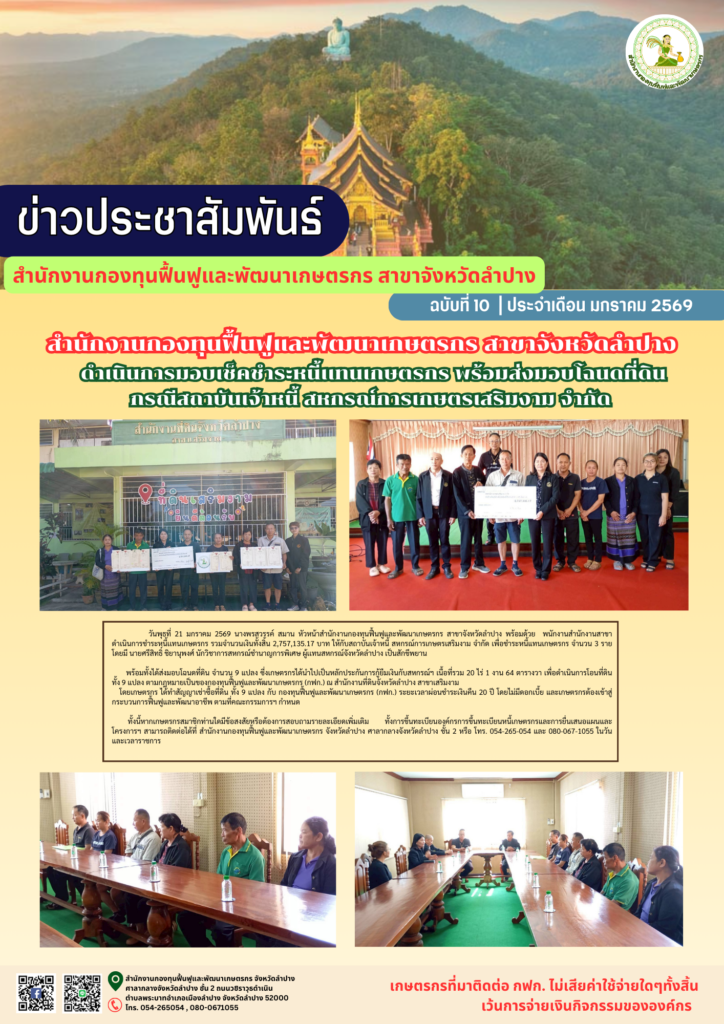 นางพรสวรรค์ สมาน หัวหน้าสำนักงานกองทุนฟื้นฟูและพัฒนาเกษตรกร สาขาจังหวัดลำปาง พร้อมด้วย พนักงานสำนักงานสาขา ดำเนินการชำระหนี้เเทนเกษตรกร รวมจำนวนเงินทั้งสิ้น 2,757,135.17 บาท ให้กับสถาบันเจ้าหนี้ สหกรณ์การเกษตรเสริมงาม จำกัด เพื่อชำระหนี้แทนเกษตรกร จำนวน 3 ราย โดยมี นายศรีสิทธิ์ ชิยานุพงศ์ นักวิชาการสหกรณ์ชำนาญการพิเศษ ผู้เเทนสหกรณ์จังหวัดลำปาง เป็นสักขีพยาน