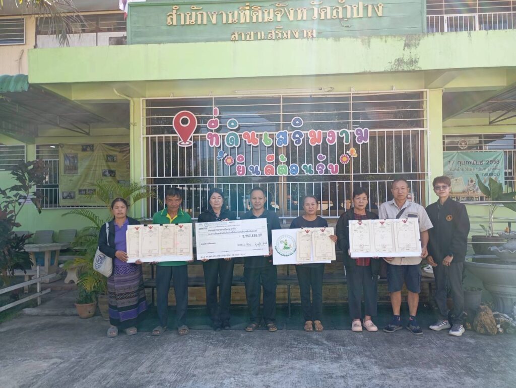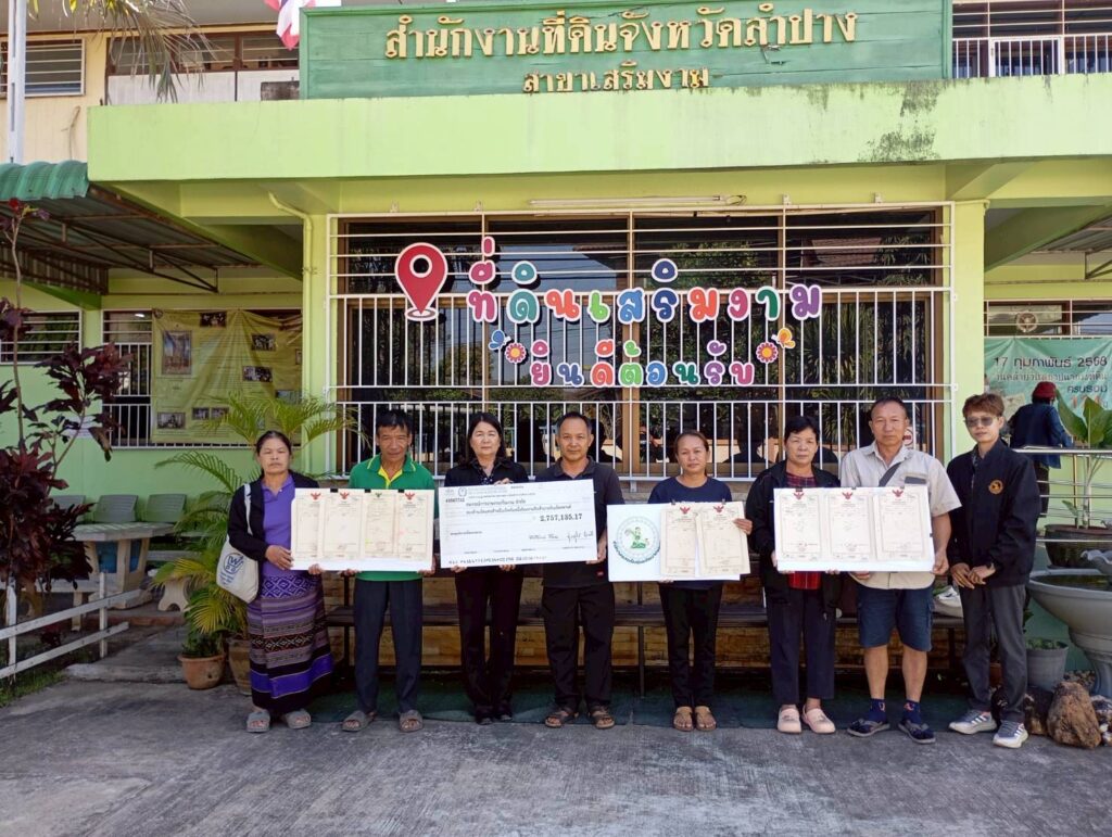 พร้อมทั้งได้ส่งมอบโฉนดที่ดิน จำนวน 9 แปลง ซึ่งเกษตรกรได้นำไปเป็นหลักประกันการกู้ยืมเงินกับสหกรณ์ฯ เนื้อที่รวม 20 ไร่ 1 งาน 64 ตารางวา เพื่อดำเนินการโอนที่ดิน ทั้ง 9 แปลง ตามกฎหมายเป็นของกองทุนฟื้นฟูและพัฒนาเกษตรกร (กฟก.) ณ สำนักงานที่ดินจังหวัดลำปาง สาขาเสริมงาม