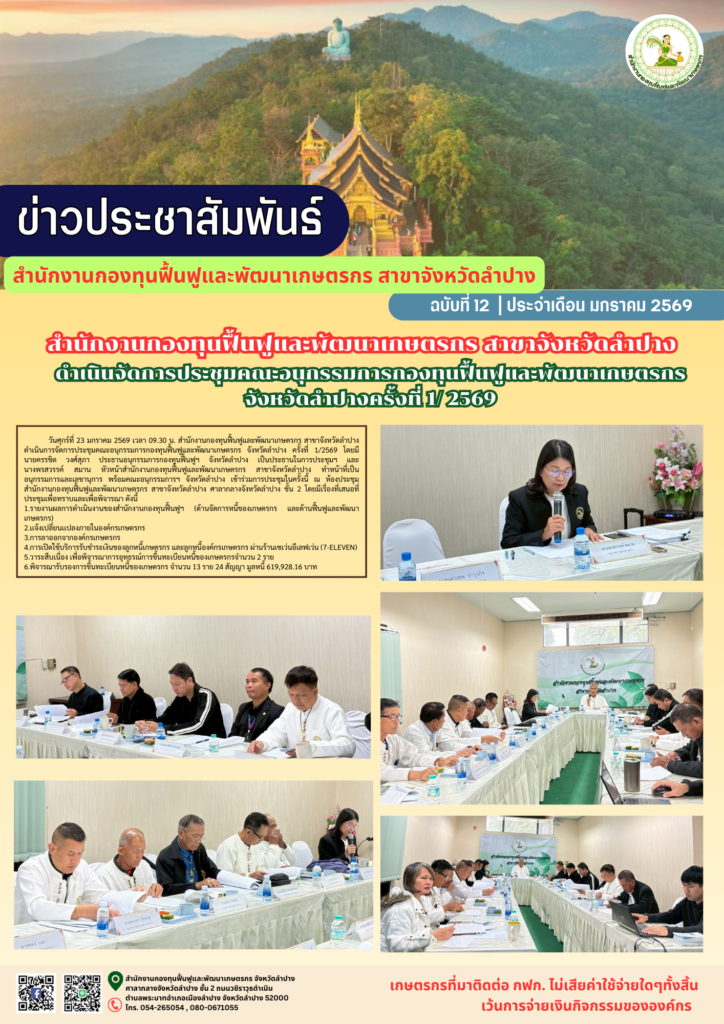 สำนักงานกองทุนฟื้นฟูและพัฒนาเกษตรกร สาขาจังหวัดลำปางดำเนินการจัดการประชุมคณะอนุกรรมการกองทุนฟื้นฟูและพัฒนาเกษตรกร จังหวัดลำปาง ครั้งที่ 1/2569 โดยมีนายครรชิต วงศ์สุภา ประธานอนุกรรมการกองทุนฟื้นฟูฯ จังหวัดลำปาง เป็นประธานในการประชุมฯ และนางพรสวรรค์ สมาน หัวหน้าสำนักงานกองทุนฟื้นฟูและพัฒนาเกษตรกร สาขาจังหวัดลำปาง ทำหน้าที่เป็นอนุกรรมการและเลขานุการ พร้อมคณะอนุกรรมการฯ จังหวัดลำปาง เข้าร่วมการประชุมในครั้งนี้ ณ ห้องประชุมสำนักงานกองทุนฟื้นฟูและพัฒนาเกษตรกร สาขาจังหวัดลำปาง ศาลากลางจังหวัดลำปาง ชั้น 2 โดยมีเรื่องที่เสนอที่ประชุมเพื่อทราบและเพื่อพิจารณา ดังนี้