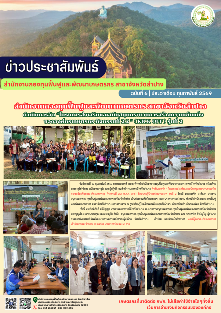 สำนักงานกองทุนฟื้นฟูและพัฒนาเกษตรกร สาขาจังหวัดลำปาง ดำเนินการจัด “โครงการส่งเสริมและสนับสนุนกระบวนการสร้างความเข้มแข็งขององค์กรเกษตรกร กิจกรรมที่ 2.2 ” ( kick off ) รุ่นที่ 2
