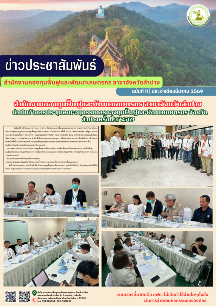 สำนักงานกองทุนฟื้นฟูและพัฒนาเกษตรกร สาขาจังหวัดลำปางดำเนินการจัดการประชุมคณะอนุกรรมการกองทุนฟื้นฟูและพัฒนาเกษตรกร จังหวัดลำปาง ครั้งที่ 3/2569 โดยมีนายครรชิต วงศ์สุภา ประธานอนุกรรมการกองทุนฟื้นฟูฯ จังหวัดลำปาง เป็นประธานในการประชุมฯ และนางพรสวรรค์ สมาน หัวหน้าสำนักงานกองทุนฟื้นฟูและพัฒนาเกษตรกร สาขาจังหวัดลำปาง ทำหน้าที่เป็นอนุกรรมการและเลขานุการ พร้อมคณะอนุกรรมการฯ จังหวัดลำปาง เข้าร่วมการประชุมในครั้งนี้ ณ ห้องประชุมสำนักงานกองทุนฟื้นฟูและพัฒนาเกษตรกร สาขาจังหวัดลำปาง ศาลากลางจังหวัดลำปาง ชั้น 2