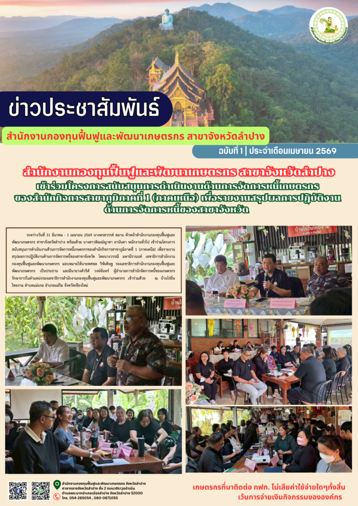 นางพรสวรรค์ สมาน หัวหน้าสำนักงานกองทุนฟื้นฟูและพัฒนาเกษตรกร สาขาจังหวัดลำปาง พร้อมด้วย นางสาวติณณ์ญาดา ยานันตา พนักงานทั่วไป เข้าร่วมโครงการสนับสนุนการดำเนินงานด้านการจัดการหนี้เกษตรกรของสำนักกิจการสาขาภูมิภาคที่ 1 (ภาคเหนือ) เพื่อรายงานสรุปผลการปฏิบัติงานด้านการจัดการหนี้ของสาขาจังหวัด โดยนางวรรณี มหานีรานนท์ เลขาธิการสำนักงานกองทุนฟื้นฟูและพัฒนาเกษตรกร มอบหมายให้นายทศพล วิชัยดิษฐ รองเลขาธิการสำนักงานกองทุนฟื้นฟูและพัฒนาเกษตรกร เป็นประธาน และมีนายวงศ์วริศ์ วงษ์จันทร์ ผู้อำนวยการสำนักจัดการหนี้ของเกษตรกร รักษาการในตำแหน่งรองเลขาธิการสำนักงานกองทุนฟื้นฟูและพัฒนาเกษตรกร เข้าร่วมด้วย ณ บ้านไร่ถิ่นไทยงาม ตำบลแม่แรม อำเภอแม่ริม จังหวัดเชียงใหม่