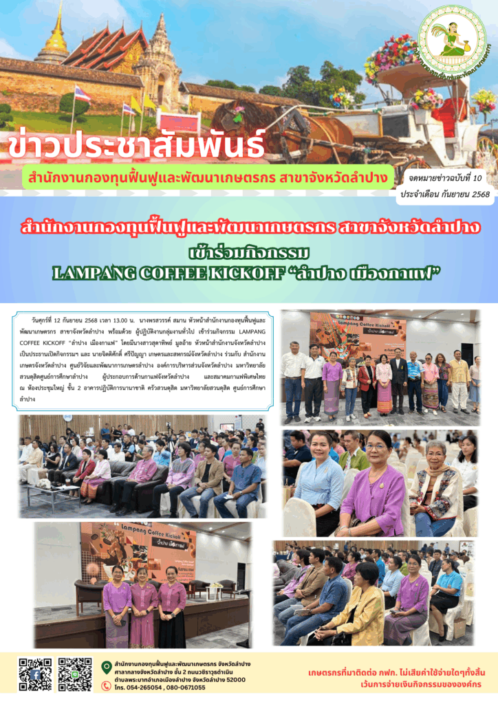 นางพรสวรรค์ สมาน หัวหน้าสำนักงานกองทุนฟื้นฟูและพัฒนาเกษตรกร สาขาจังหวัดลำปาง พร้อมด้วย ผู้ปฏิบัติงานกลุ่มงานทั่วไป เข้าร่วมกิจกรรม Lampang Coffee Kickoff “ลำปาง เมืองกาแฟ” โดยมีนางสาวสุดาทิพย์ มูลอ้าย หัวหน้าสำนักงานจังหวัดลำปาง เป็นประธานเปิดกิจกรรมฯ และ นายจิตติศักดิ์ ศรีปัญญา เกษตรและสหกรณ์จังหวัดลำปาง ร่วมกับ สำนักงานเกษตรจังหวัดลำปาง ศูนย์วิจัยและพัฒนาการเกษตรลำปาง องค์การบริหารส่วนจังหวัดลำปาง มหาวิทยาลัยสวนดุสิตศูนย์การศึกษาลำปาง ผู้ประกอบการด้านกาแฟจังหวัดลำปาง และสมาคมกาแฟพิเศษไทย ณ ห้องประชุมใหญ่ ชั้น 2 อาคารปฏิบัติการนานาชาติ ครัวสวนดุสิต มหาวิทยาลัยสวนดุสิต ศูนย์การศึกษา ลำปาง