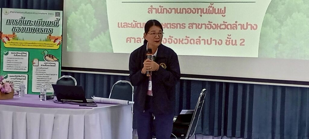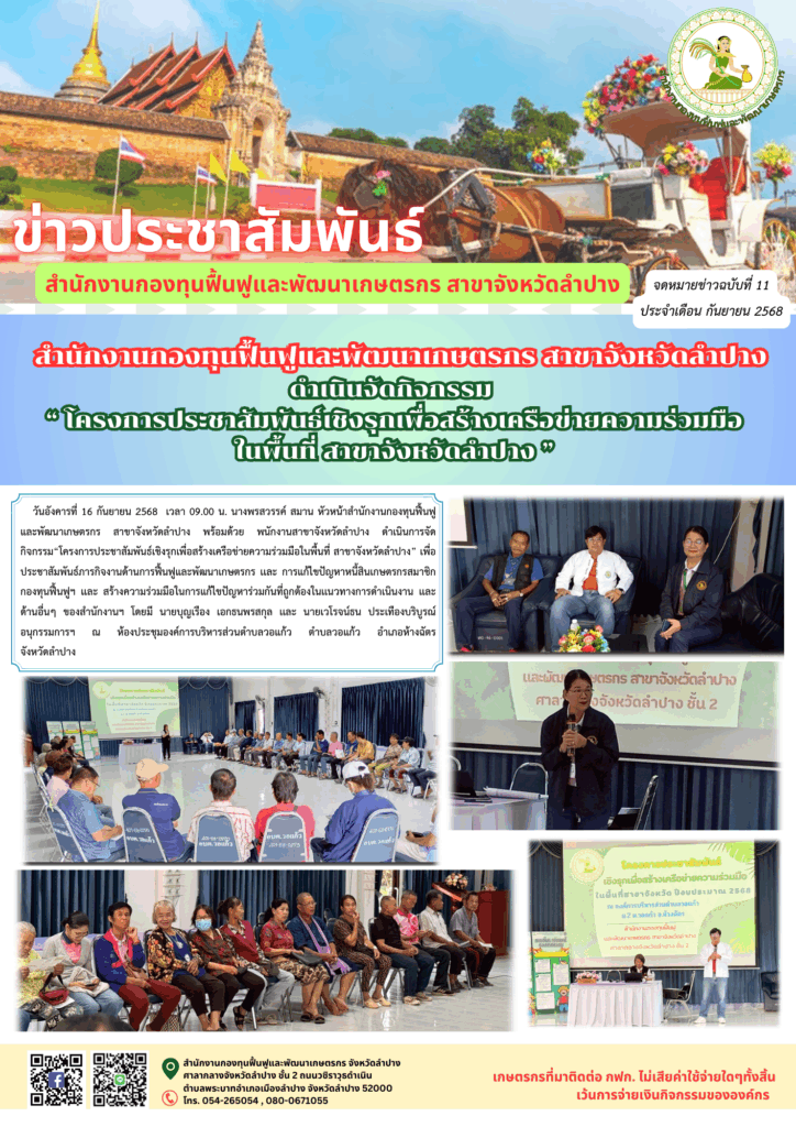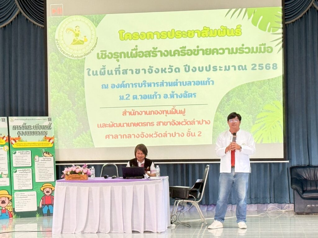 นางพรสวรรค์ สมาน หัวหน้าสำนักงานกองทุนฟื้นฟูและพัฒนาเกษตรกร สาขาจังหวัดลำปาง พร้อมด้วย พนักงานสาขาจังหวัดลำปาง ดำเนินการจัดกิจกรรม “โครงการประชาสัมพันธ์เชิงรุกเพื่อสร้างเครือข่ายความร่วมมือในพื้นที่ สาขาจังหวัดลำปาง” เพื่อประชาสัมพันธ์ภารกิจงานด้านการฟื้นฟูและพัฒนาเกษตรกร เเละ การแก้ไขปัญหาหนี้สินเกษตรกรสมาชิกกองทุนฟื้นฟูฯ เเละ สร้างความร่วมมือในการแก้ไขปัญหาร่วมกันที่ถูกต้องในเเนวทางการดำเนินงาน เเละด้านอื่นๆ ของสำนักงานฯ โดยมี นายบุญเรือง เอกธนพรสกุล เเละ นายเวโรจน์ธน ประเทืองบริบูรณ์ อนุกรรมการฯ ณ ห้องประชุมองค์การบริหารส่วนตำบลวอแก้ว ตำบลวอแก้ว อำเภอห้างฉัตร จังหวัดลำปาง