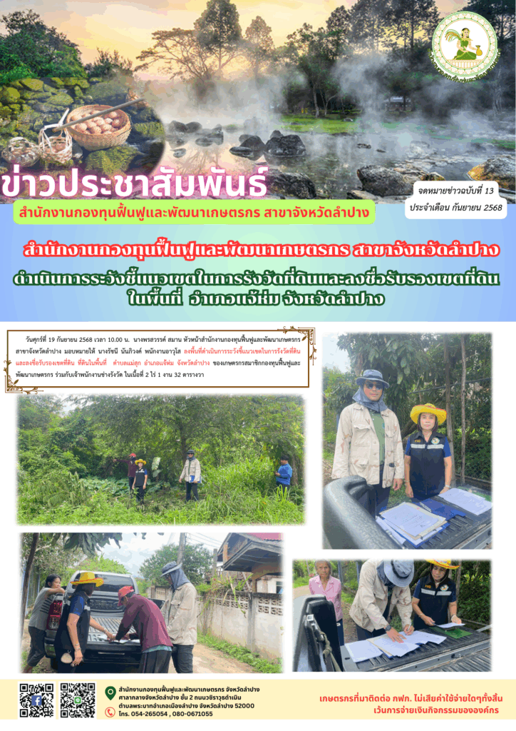 นางพรสวรรค์ สมาน หัวหน้าสำนักงานกองทุนฟื้นฟูและพัฒนาเกษตรกร สาขาจังหวัดลำปาง มอบหมายให้ นางรัชนี นันภิวงค์ พนักงานอาวุโส ลงพื้นที่ดำเนินการระวังชี้เเนวเขตในการรังวัดที่ดินและลงชื่อรับรองเขตที่ดิน ที่ดินในพื้นที่ ตำบลเเม่สุก อำเภอเเจ้ห่ม จังหวัดลำปาง ของเกษตรกรสมาชิกกองทุนฟื้นฟูและพัฒนาเกษตรกร ร่วมกับเจ้าพนักงานช่างรังวัด ในเนื้อที่ 2 ไร่ 1 งาน 32 ตารางวา