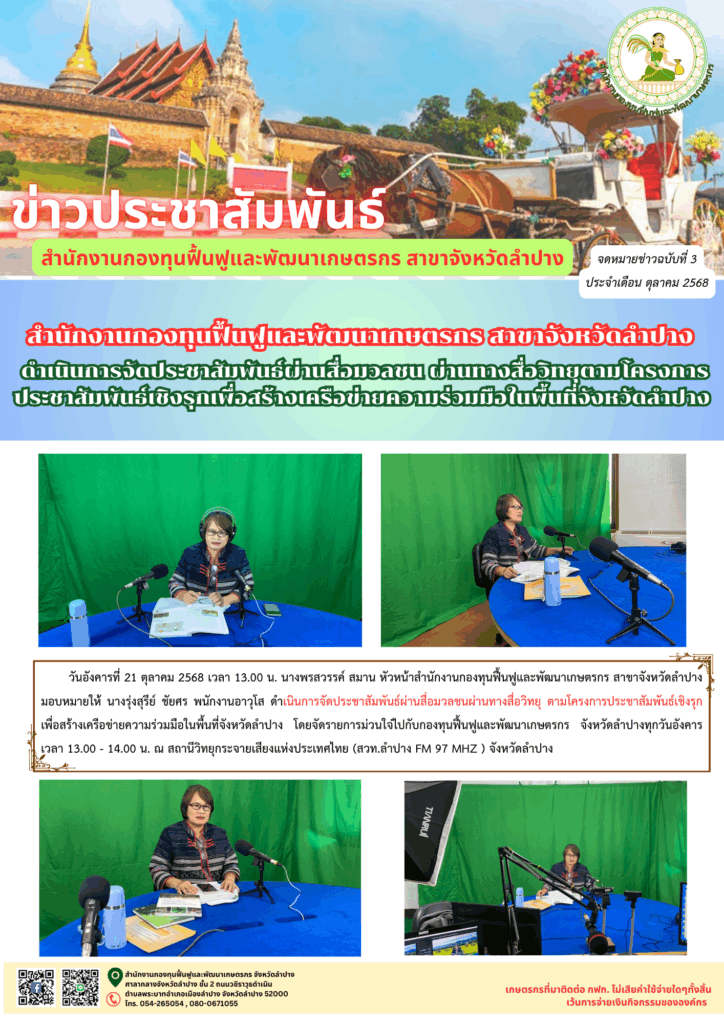 นางพรสวรรค์ สมาน หัวหน้าสำนักงานกองทุนฟื้นฟูและพัฒนาเกษตรกร สาขาจังหวัดลำปาง มอบหมายให้ นางรุ่งสุรีย์ ชัยศร พนักงานอาวุโส ดำเนินการจัดประชาสัมพันธ์ผ่านสื่อมวลชนผ่านทางสื่อวิทยุ ตามโครงการประชาสัมพันธ์เชิงรุก เพื่อสร้างเครือข่ายความร่วมมือในพื้นที่จังหวัดลำปาง โดยจัดรายการม่วนใจ๋ไปกับกองทุนฟื้นฟูและพัฒนาเกษตรกร จังหวัดลำปางทุกวันอังคาร เวลา 13.00 – 14.00 น. ณ สถานีวิทยุกระจายเสียงแห่งประเทศไทย (สวท.ลำปาง FM 97 MHz) จังหวัดลำปาง
