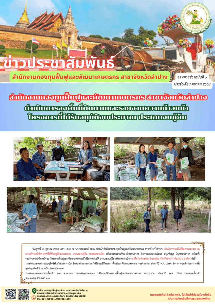 นางพรสวรรค์ สมาน หัวหน้าสำนักงานกองทุนฟื้นฟูและพัฒนาเกษตรกร สาขาจังหวัดลำปาง ดำเนินการลงพื้นที่ติดตามและรายงานความก้าวหน้าโครงการที่ได้รับอนุมัติงบประมาณ ประเภทงบกู้ยืม (ปลอดดอกเบี้ย) เพื่อประชุมร่วมกับองค์กรเกษตรกร ติดตามและประเมินผล สรุปข้อมูล ปัญหาอุปสรรค พร้อมทั้งรายงานความก้าวหน้าของโครงการฟื้นฟูและพัฒนาเกษตรกรที่ได้รับการอนุมัติ ประเภทงบกู้ยืม (ปลอดดอกเบี้ย) ณ ที่ทำการองค์กร อำเภอเถิน จังหวัดลำปาง จำนวน 2 องค์กร ดังนี้