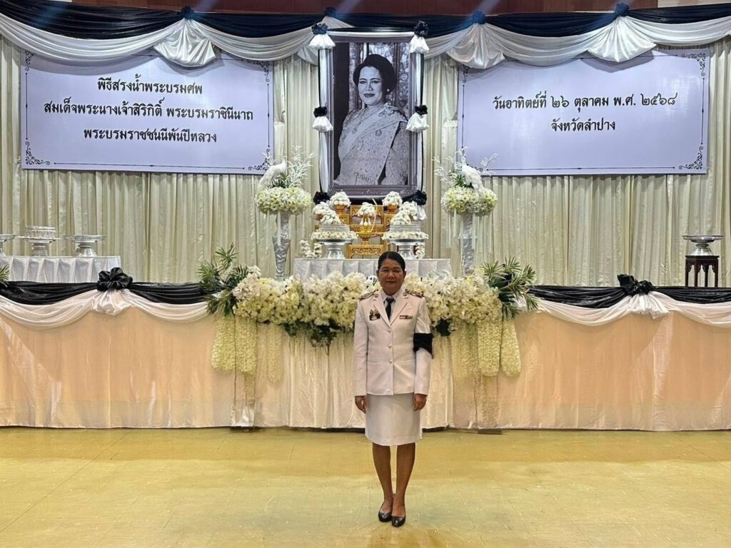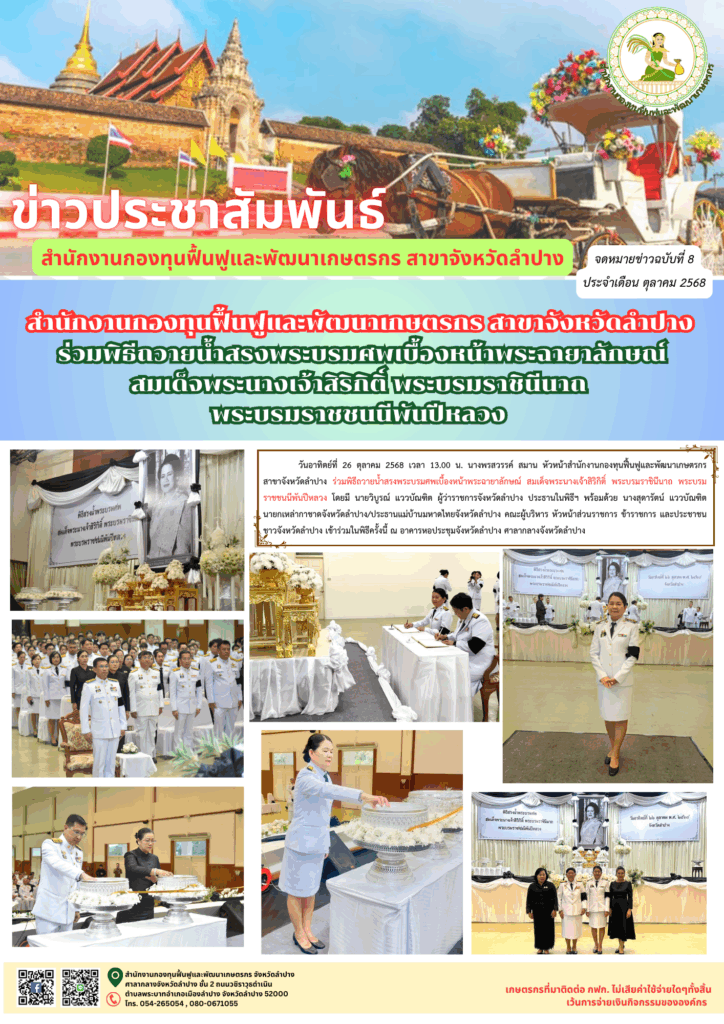 นางพรสวรรค์ สมาน หัวหน้าสำนักงานกองทุนฟื้นฟูและพัฒนาเกษตรกร สาขาจังหวัดลำปาง ร่วมพิธีถวายน้ำสรงพระบรมศพเบื้องหน้าพระฉายาลักษณ์ สมเด็จพระนางเจ้าสิริกิติ์ พระบรมราชินีนาถ พระบรมราชชนนีพันปีหลวง โดยมี นายวิบูรณ์ แววบัณฑิต ผู้ว่าราชการจังหวัดลำปาง ประธานในพิธีฯ พร้อมด้วย นางสุดารัตน์ แววบัณฑิต นายกเหล่ากาชาดจังหวัดลำปาง/ประธานแม่บ้านมหาดไทยจังหวัดลำปาง คณะผู้บริหาร หัวหน้าส่วนราชการ ข้าราชการ และประชาชนชาวจังหวัดลำปาง เข้าร่วมในพิธีครั้งนี้ ณ อาคารหอประชุมจังหวัดลำปาง ศาลากลางจังหวัดลำปาง