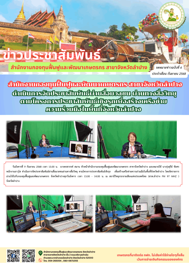 นางพรสวรรค์ สมาน หัวหน้าสำนักงานกองทุนฟื้นฟูและพัฒนาเกษตรกร สาขาจังหวัดลำปาง มอบหมายให้ นางรุ่งสุรีย์ ชัยศร พนักงานอาวุโส ดำเนินการจัดประชาสัมพันธ์ผ่านสื่อมวลชนผ่านทางสื่อวิทยุ ตามโครงการประชาสัมพันธ์เชิงรุก เพื่อสร้างเครือข่ายความร่วมมือในพื้นที่จังหวัดลำปาง โดยจัดรายการม่วนใจ๋ไปกับกองทุนฟื้นฟูและพัฒนาเกษตรกร จังหวัดลำปางทุกวันอังคาร เวลา 13.00 – 14.00 น. ณ สถานีวิทยุกระจายเสียงแห่งประเทศไทย (สวท.ลำปาง FM 97 MHz) จังหวัดลำปาง