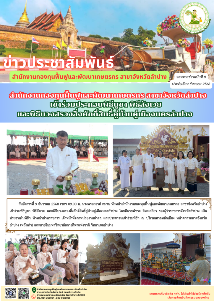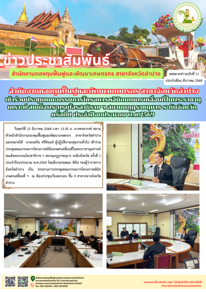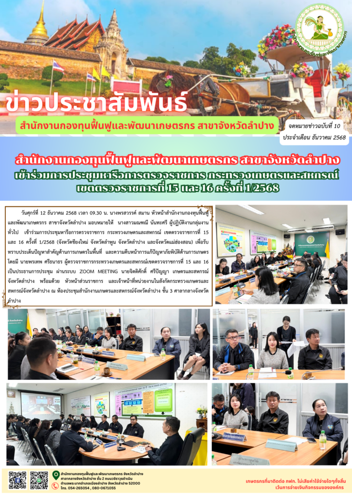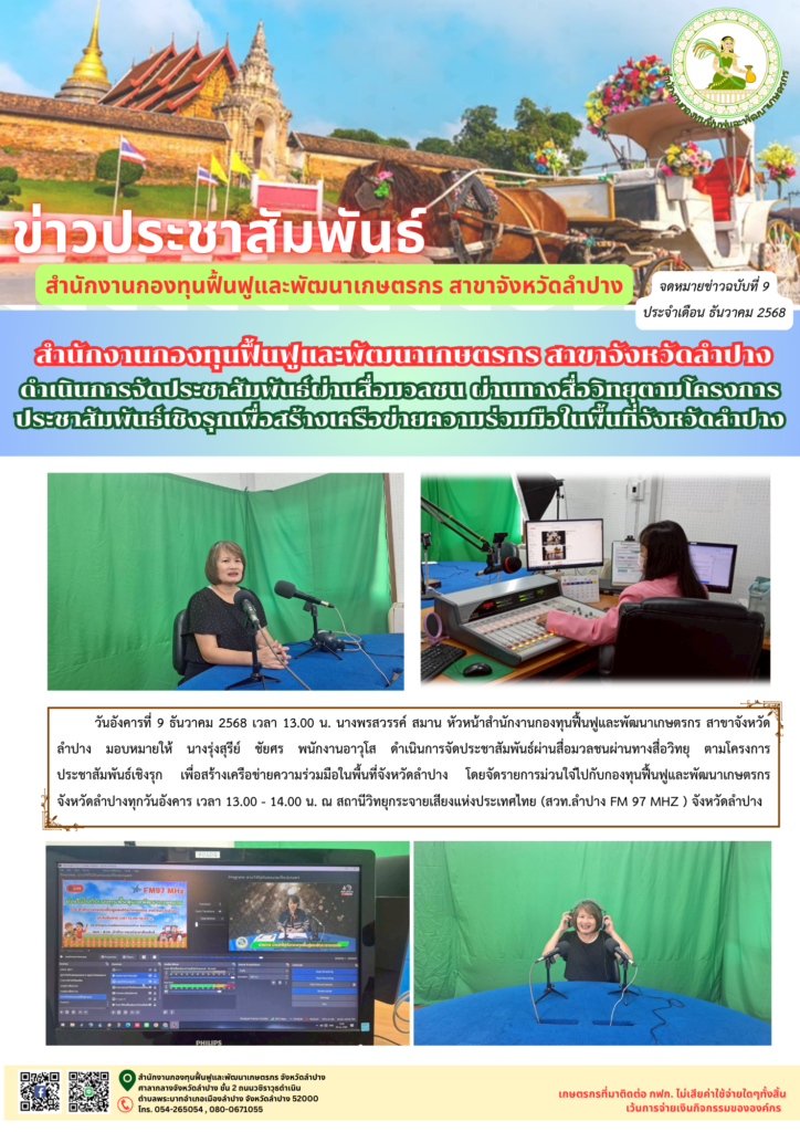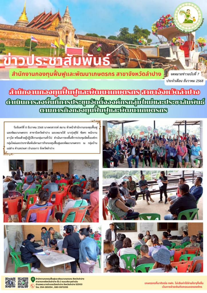 ทั้งนี้หากเกษตรกรสมาชิกท่านใดมีข้อสงสัยหรือต้องการสอบถามรายละเอียดเพิ่มเติม ทั้งการขึ้นทะเบียนองค์กรการขึ้นทะเบียนหนี้เกษตรกรและการยื่นเสนอแผนและโครงการสามารถติดต่อได้ที่ สำนักงานกองทุนฟื้นฟูและพัฒนาเกษตรกร จังหวัดลำปาง ศาลากลางจังหวัดลำปาง ชั้น 2 หรือโทร. 054-265-054 และ 080-067-1055 ในวันและเวลาราชการ