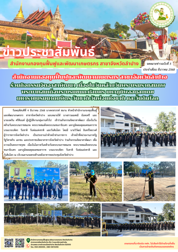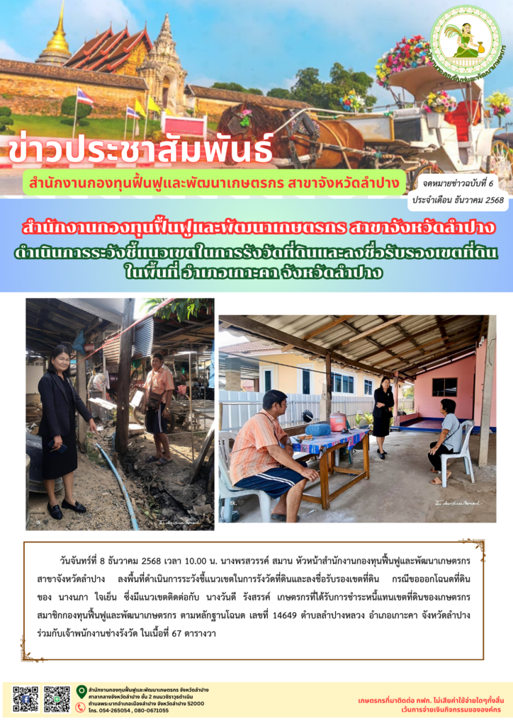 นางพรสวรรค์ สมาน หัวหน้าสำนักงานกองทุนฟื้นฟูและพัฒนาเกษตรกร สาขาจังหวัดลำปาง ดำเนินการโอนกรรมสิทธิ์ และส่งมอบหลักประกันคืนเกษตรกร เนื้อที่ทั้งหมดจำนวน 2 แปลง พื้นที่ 2 ไร่ 1 งาน 4 ตารางวา เเละ 2 ไร่ 0 งาน 23 ตารางวา ณ สำนักงานที่ดินจังหวัดลำปาง โดยเกษตรกรได้รับการชำระหนี้แทนจากกองทุนฟื้นฟูและพัฒนาเกษตรกร และได้ผ่อนชำระเงินคืนครบกำหนดตามแผนชำระเงินแล้ว จึงขอไถ่ถอนหลักประกันตามขั้นตอนของกองทุนฟื้นฟูฯ