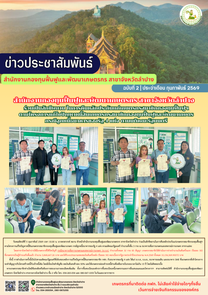 โดยสาขาจังหวัดลำปางได้มีเกษตรกรที่ได้ปิดบัญชี กรณีธนาคารเพื่อการเกษตรและสหกรณ์การเกษตร (ธ.ก.ส.) จำนวนทั้งหมด 32 ราย 85 สัญญา เกษตรกรสมาชิกได้ดำเนินการจ่ายจำนวนเงินต้นครึ่งแรก (ร้อยละ 50) ที่เกษตรกรเป็นผู้ชำระเสร็จสิ้นแล้ว จำนวน 3,868,667.26 บาท เเละได้รับงบประมาณชดเชยเงินต้นครึ่งหลัง (ร้อยละ 50) ดอกเบี้ยจากรัฐบาลประจำปีงบประมาณ พ.ศ.2569 ทั้งหมด 10,156,569.90072 บาท