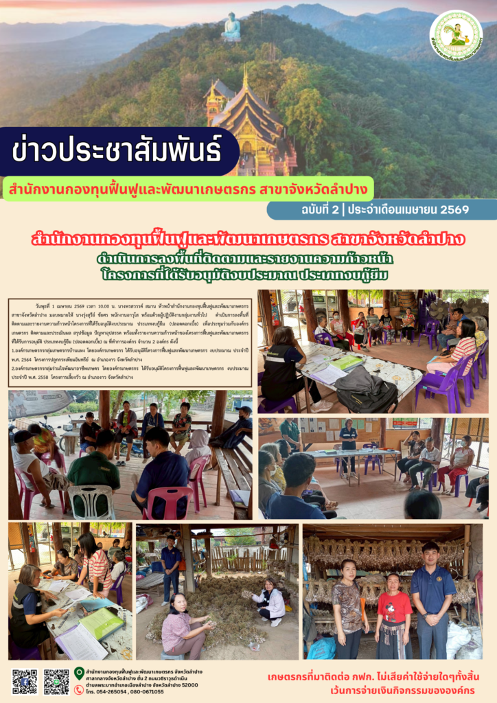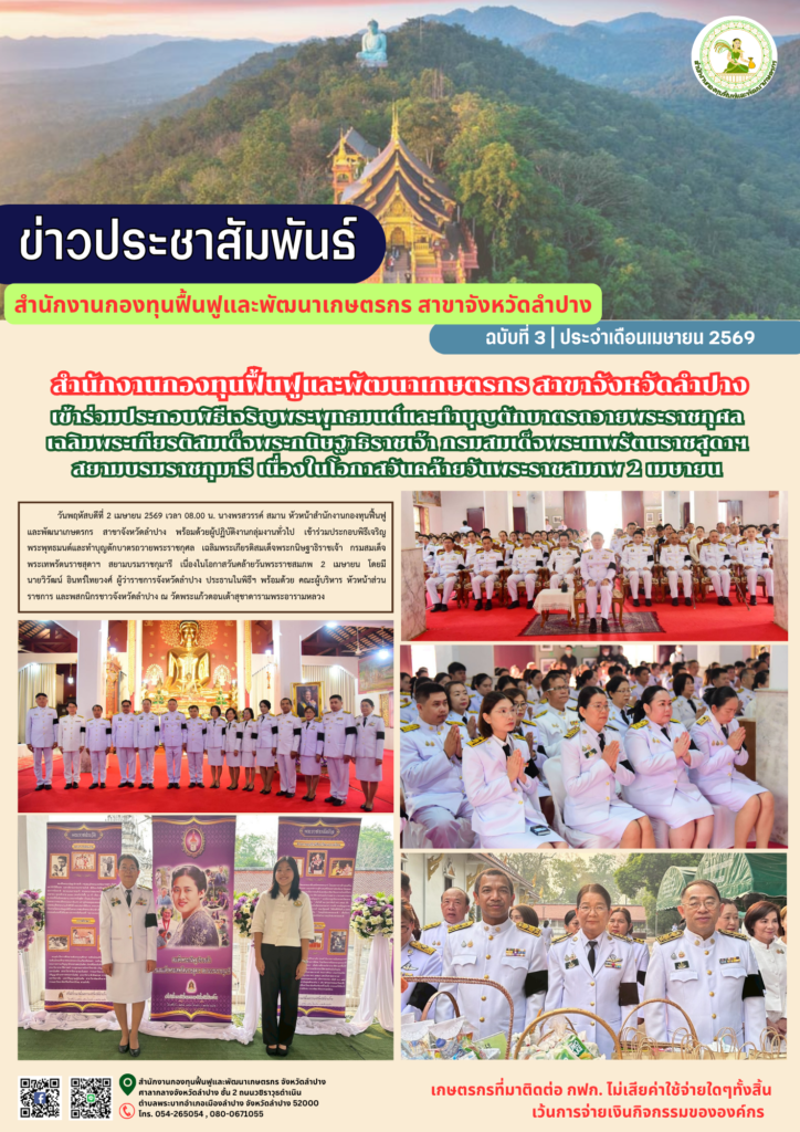 นางพรสวรรค์ สมาน หัวหน้าสำนักงานกองทุนฟื้นฟูและพัฒนาเกษตรกร สาขาจังหวัดลำปาง พร้อมด้วยผู้ปฏิบัติงานกลุ่มงานทั่วไป เข้าร่วมประกอบพิธีเจริญพระพุทธมนต์และทำบุญตักบาตรถวายพระราชกุศล เฉลิมพระเกียรติสมเด็จพระกนิษฐาธิราชเจ้า กรมสมเด็จพระเทพรัตนราชสุดาฯ สยามบรมราชกุมารี เนื่องในโอกาสวันคล้ายวันพระราชสมภพ 2 เมษายน โดยมี นายวิวัฒน์ อินทร์ไทยวงศ์ ผู้ว่าราชการจังหวัดลำปาง ประธานในพิธีฯ พร้อมด้วย คณะผู้บริหาร หัวหน้าส่วนราชการ และพสกนิกรชาวจังหวัดลำปาง ณ วัดพระแก้วดอนเต้าสุชาดารามพระอารามหลวง